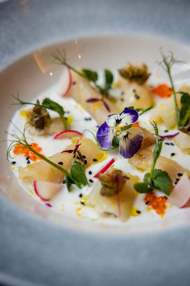 - Saumon fumé, crème au zeste de combava et herbes fraîches