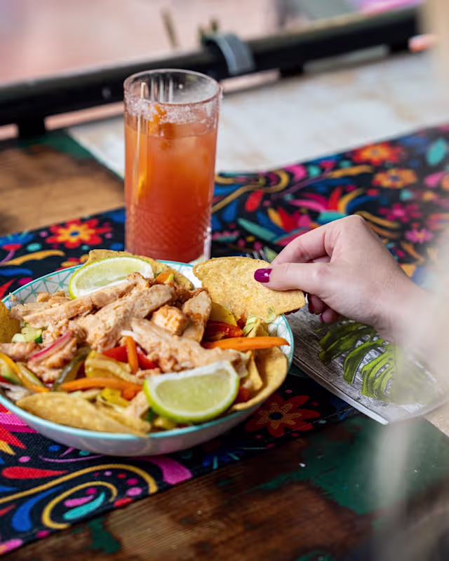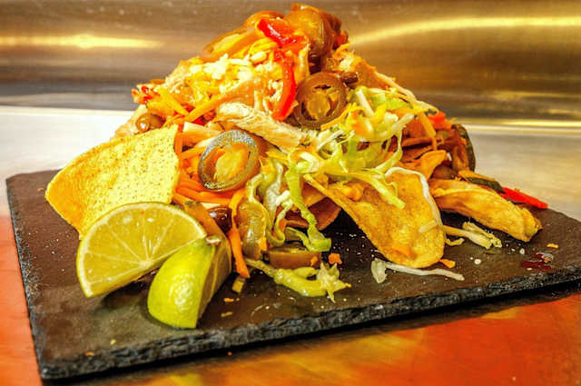 - Chilaquiles, un piatto unico dalle note piacevolmente speziate che stuzzica senza dubbio l'appetito. Tortillas chips saltati con salsa roja, uovo all'occhio di bue, gamberi e manzo alla piastra, chimichurri messicano, fettine di avocado, cipolla agrodolce.