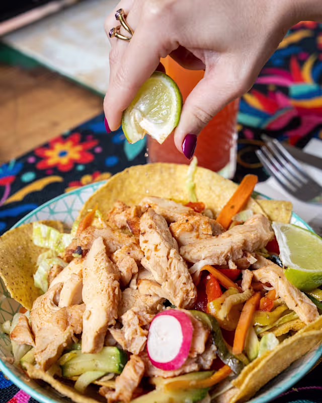 - Petto di pollo (+) tagliato a strisce saltato in padella insieme a spezie, gamberi (+) e verdure (peperoni, zucchine, carote). Accompagnato con insalata, riso, pannocchia, tortillas e guacamole.