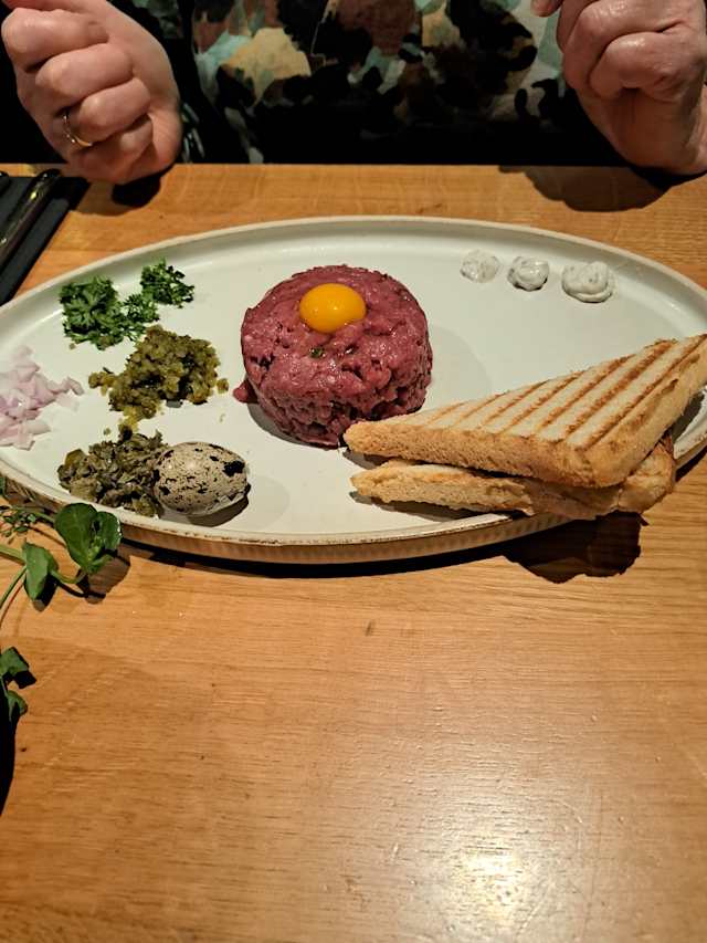 - Met toast, soepje, gepocheerd ei, carpaccio, gerookte zalm en rendangkroketje