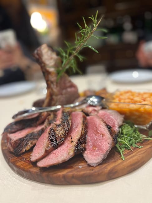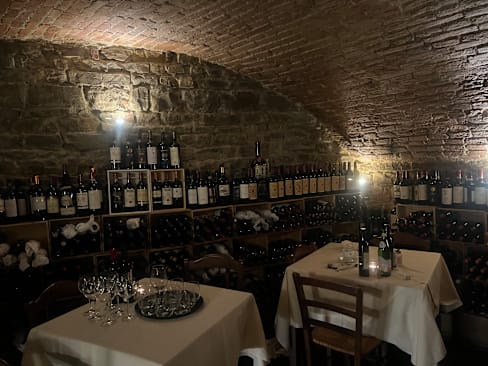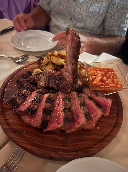 10/10Our table was in the wine cellar which was so romantic. Our waiter helped us find a delightful wine. We shared shrimp risotto and the steak florentine. The presentation was so dramatic. Tasted better than it looked. They only cook it rare but it was yummy. The potato’s were divine. My only complaint was the tiramisu. It was kind of runny. Did not finish. Had plenty of leftovers for sandwiches the next day. Overall beautiful experience. Recommend highly