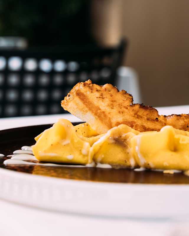 - Fonduta di roquefort, cavolo nero, salsa di aglio nero e crumble di amaretti