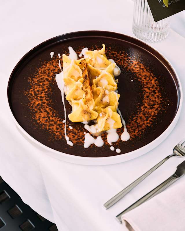 - Salsa allo zafferano, cozze, fonduta di provola affumicata e chips di guanciale