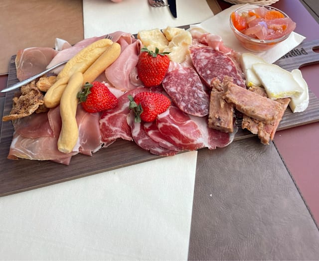 Prosciutto di parma DOP 24 mesi, mortadella IGP, coppa piacentina DOP, pancetta DOP di piacenza, cicciolata, ciccioli, giardiniera di nostra produzione, scaglie di parmigiano reggiano DOP, formaggio, grissini e frutta di stagione