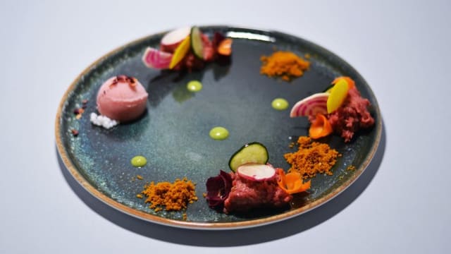 Cotto a bassa temperatura, mousse delicata di tonno, capperi in fiore, cipolla caramellata