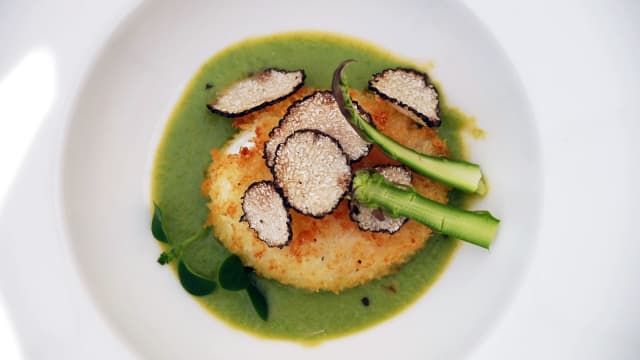 Uovo alla nerano.. uovo in crosta di panko, zucchine e provolone del monaco