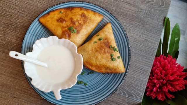 Rijkelijk gevulde pasteien, gevuld naar keuze met kip, gehakt of groenten, gereseveerd met chilisaus of yogurt