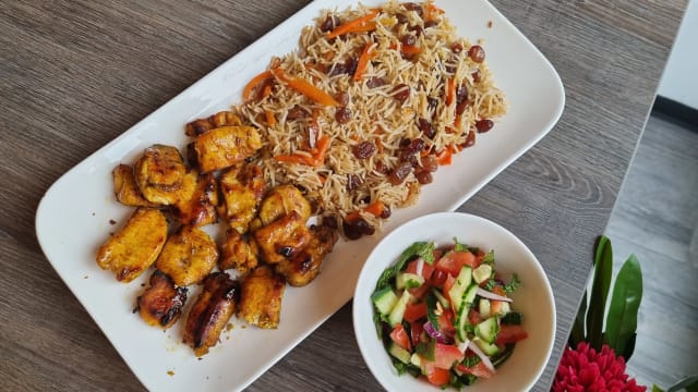 Afghaanse rijst geserveerd met curry naar keuze, naan brood en frisse salade