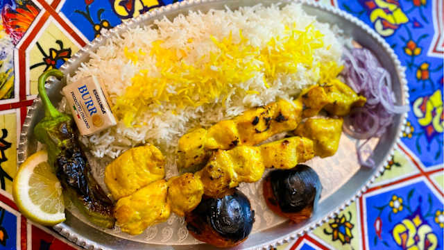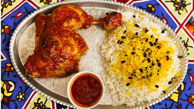 - Zereshk (Crespino essiccato), Riso, Pollo, Zafferano Riso basmati profumato allo zafferano, guarnito con crespino dal sapore aspro e burroso, per un perfetto equilibrio tra sapori dolci e aspri.