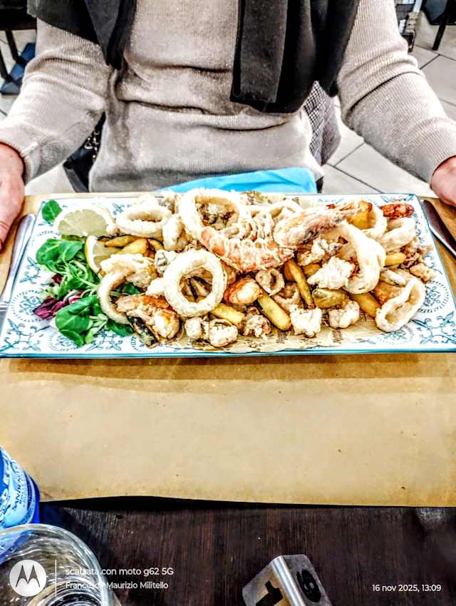 - Annelli di totano, latterini, ciuffetti di calamari, mazzancolle tropicali e verdure pastellate