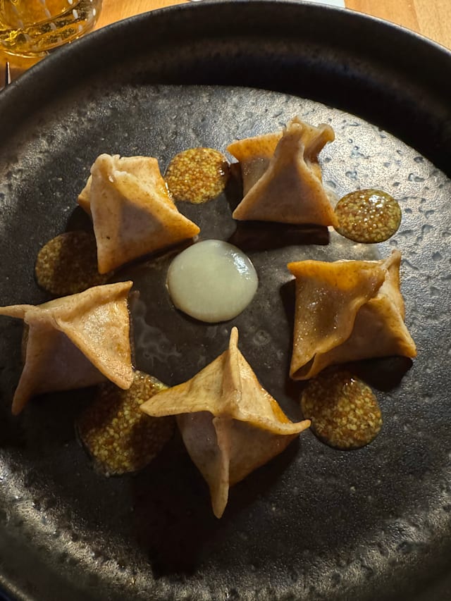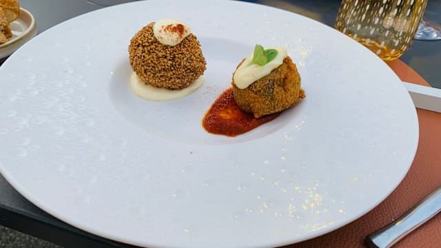 Polpetta* di melanzana violetta siciliana su crema di pecorino dop siciliano e crema di pomodoro bruciato