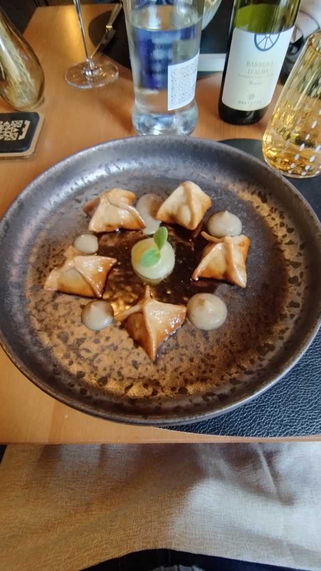- Agnolotti del plin ripieni di borragine, con crema di robiola di roccaverano DOP e cavolo nero con croccante alla nocciola piemonte igp delle langhe bio.