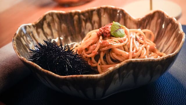 - Spaghetto trafilato a bronzo di grani antichi siciliani “mulino angelica” con ragù al nero di seppia, bernese al pecorino romano DOP e crumble di guanciale “suino astigiano”.