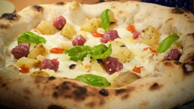 Mozzarella di bufala campana DOP, salamino piccante. Fuori cottura: datterino giallo, crema di ‘nduja di spilinga,cipolla di giarratana in agrodolce e filamenti di ito togarashi.