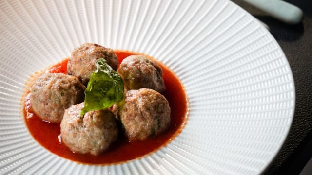Polpetta* di melanzana violetta siciliana su crema di pecorino dop siciliano e crema di pomodoro bruciato