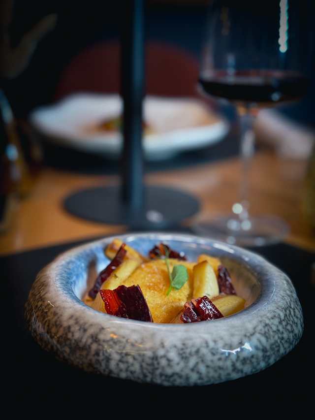 - Fuori cottura: brunoise di zucca mantovana cotta nel vermouth di torino ed erbe pedemontane, lard’ “suini di muncalè macelleria al castello”, fonduta di montebore DOP, cardoncelli trifolati, hito-togarashi ed EVO monocultivar Nocellara del belice sicilia igp giardini di carlo “manfredi barbera”.