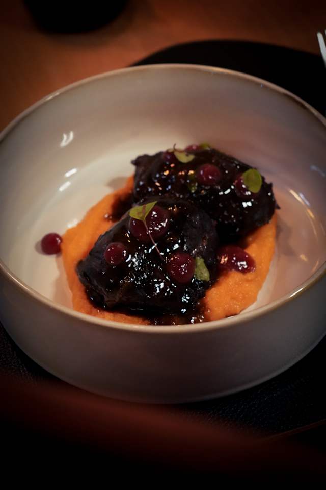 - Guancia di maialino “suino astigiano” CBT stracotta, il suo jus, patata americana affumicata e coulis di melograno.