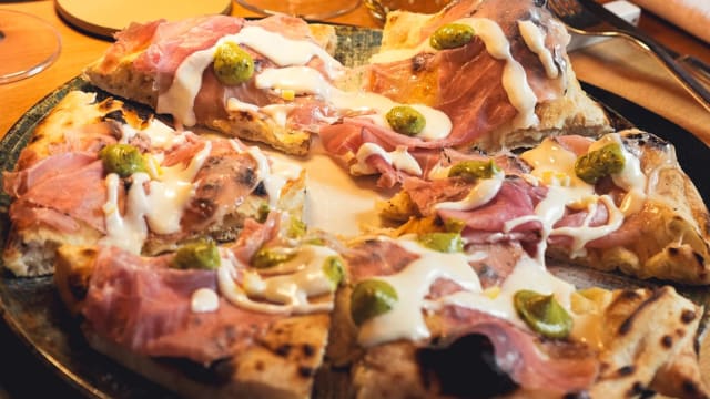 Fior di latte, salamino piccante, funghi champignon e cuor di carciofini arrosto. Fuori cottura: crema di pomodoro bruciato, prosciutto cotto e cenere di oliva nera di castelvetrano