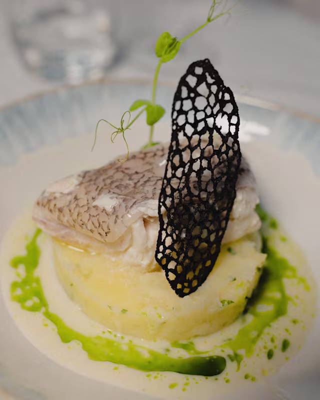 - Robalo com escamas de curgete, puré de pastinaca e molho de marisco