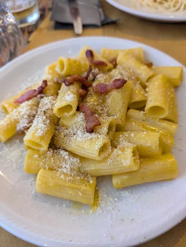 - Rigatoni pastamore fatti in casa, uova bio, pecorino romano D.O.P., guanciale di maiale az. Lanzi e pepe nero.