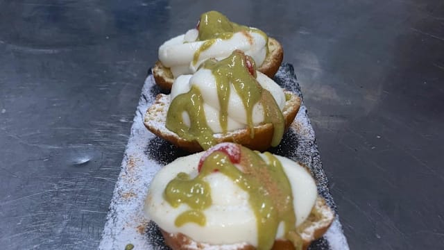Fior di latte mortadella, ciuffetti di filadelfia, burrata, pesto di pistacchio, glassa aceto balsamico,granella di pistacchio