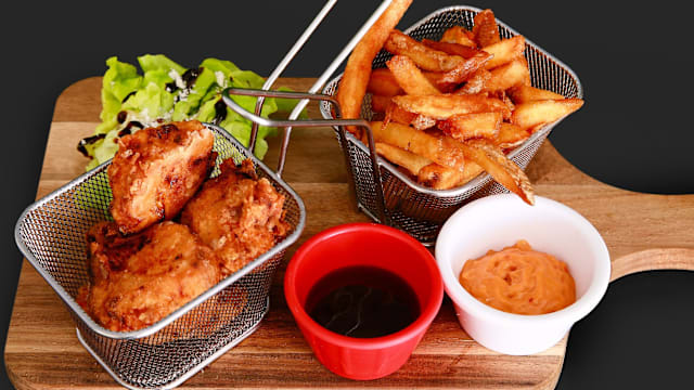 Tenders accompagné de ses frites maison, d'un jus et d'une boule de glace vanille ou d'une compote.