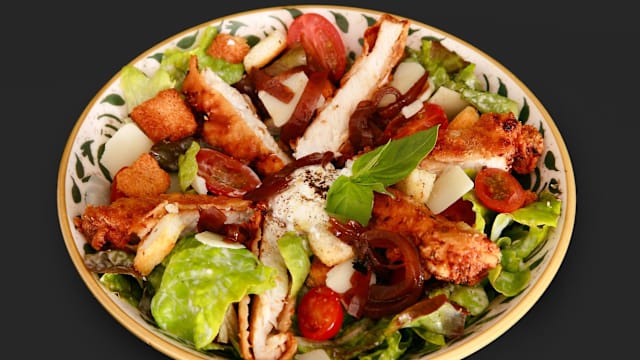 Pain burger focaccia à l'origan, tenders maison, salade, tomate. Oignons confits au balsamique, cheddar, sauce maison au pesto
