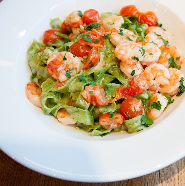 Pasta with shrimps, garlic, zucchini, cherry tomatoes and parsley in a creamy white wine sauce