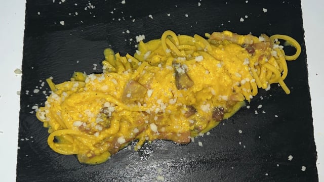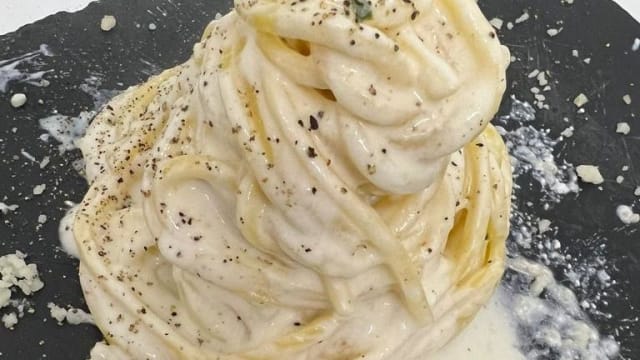 Guanciale croccante, carbocrema, pecorino romano, spolverata di pepe nero