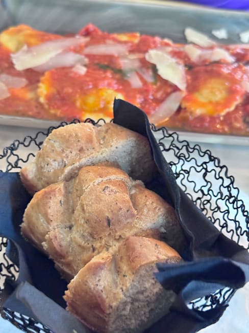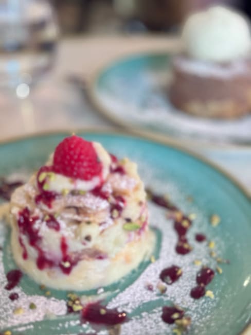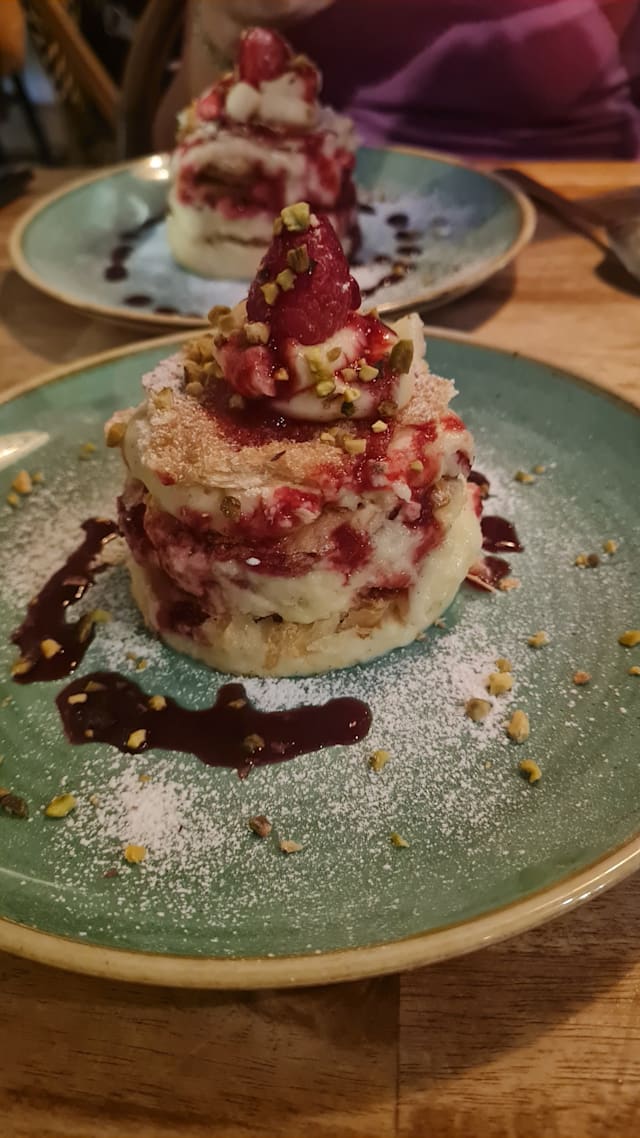 As small quaint restaurant with homemade pasta. We had reservations for when they opened at 7, highly recommend. I had the signature dish, pasta, tomatoes, olives, capers, burrata crème and oregano. Hubby had spinach ravioli. My dessert was delicious! Mille leaves with custard, raspberries and pistachio. His apple crumble was more like a cookie texture. Not what he expected. Service was spot on. Noticed the woman next to me wasn’t happy with her meal. No questions asked, took it away and prepared a new one. Very reasonably priced.