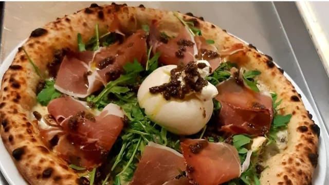 Mascarpone, fior di latte, speck, champignons, crème de truffe, burrata et roquette