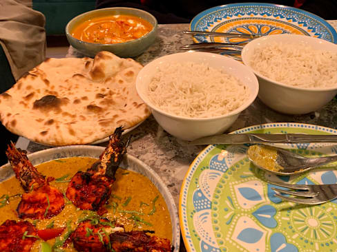 6/10Upon arrival, (with a rez), we were sat outside & eventually given a lassi as the wait progressed. We got a table next to the busy/loud kitchen. The staff was moving in, out, around- crazy. But definitely hard workers. Once settled, no time was spared and our server/greeter abruptly arrived table side expecting not only our drink oder, but the entire order. After an entree question was answered, he left and gave us a minute to decide, and brought roti and a trio of incredible sauces, a highlight of the night! Then, we waited, and waited and… waited for the water/wine. Luckily I still had my lassi, but the start to the much anticipated dinner was not going well! The shrimp w/curry: curry 8/10, shrimp overcooked: 4/10. My chicken tikka: 7.5/10. Garlic naan: 2/10- flavorless. Wine: 24e v good. The hype and 4.9 rating is not warranted, sadly.