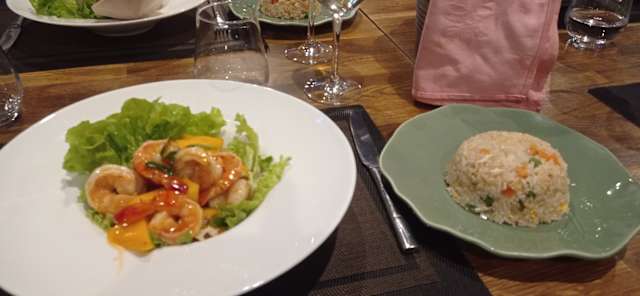 - Salade de crevettes : crevettes, concombre, oignon rouge, coriandre thaï, menthe, céleri, tomates cerises, riz grillé