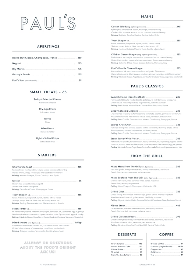 8.5/10We opted to eat in the Scandic Haymarket restaurant (Paul's) since we were staying there. We weren't disappointed. Menu choices were a bit limited but we found things we liked. Bubbles and wine were excellent. Atmosphere and movie-themed background music (not too loud or intrusive) was pleasant. Our server Fredrik was very charming and helpful.
