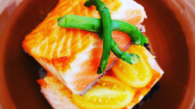 Baccalà fritto su vellutata di patate e barbabietola rossa, gin aromatizzato al corbezzolo
