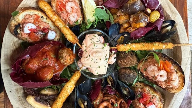 Polpette di pesce, cozze scoppiate, cocktail di gambero, calamari affogati, arancine al nero di seppia, gambero rosso marinato, caponata di pesce, bruschette dello chef, calamari fritti