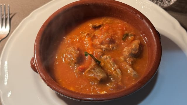 Carne di pecora, salsa di pomodoro, aromi e spezie