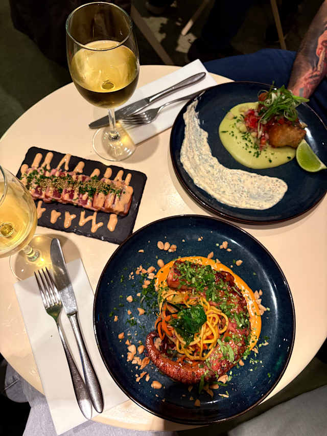 10/10When we first arrived we were welcomed and chose a seat. Of course it was early as we are accustomed to eating at 6:00. Both my husband and I are music lovers so music caught our ear and entertained is during our time here. Eric the bartender/server shared that same love so we enjoyed wonderful conversation on that subject. We had 2 different appetizers one with shrimp and the other with mussels both were fresh and delicious with a combination of what I think of as Portuguese and Thai flavors. Our main dishes were great too. Both were suggested by Eric. If we lived in Lisbon we were be here every week!!