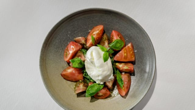 Selección de tomates, aguacate a la brasa y rabanitos encurtidos