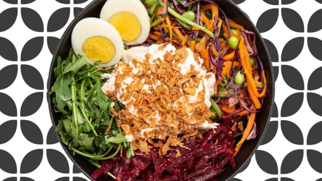 Mango, avocado, cavolo cappuccio, carote grattugiate, rucola, iceberg e mandorle