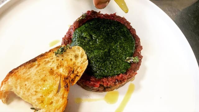Carpaccio di manzo, salsa tartara, ristretto di vitello e nocciole del piemonte