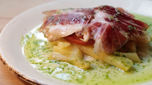 Mortero de solomillo, con jamón, patatas, tomate y salsa verde - tapa