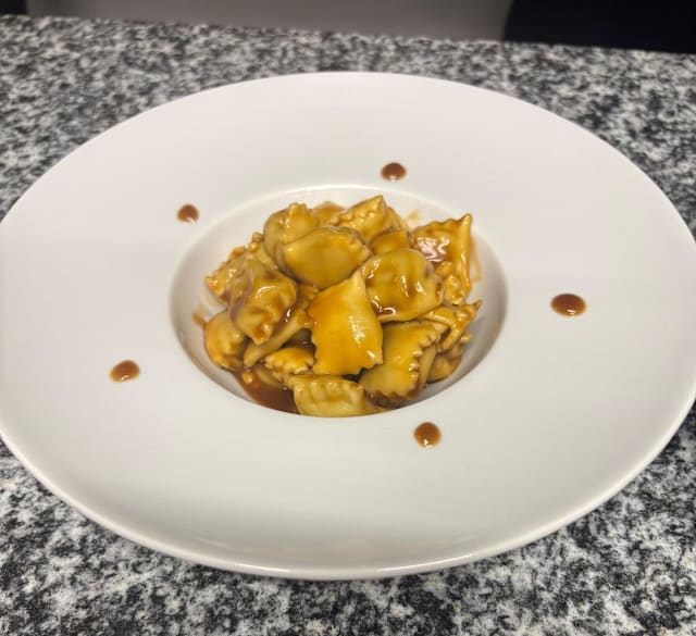 Plin con pasta fresca all’uovo, ripieni di carne di fassona piemontese, conditi con sugo d’arrosto