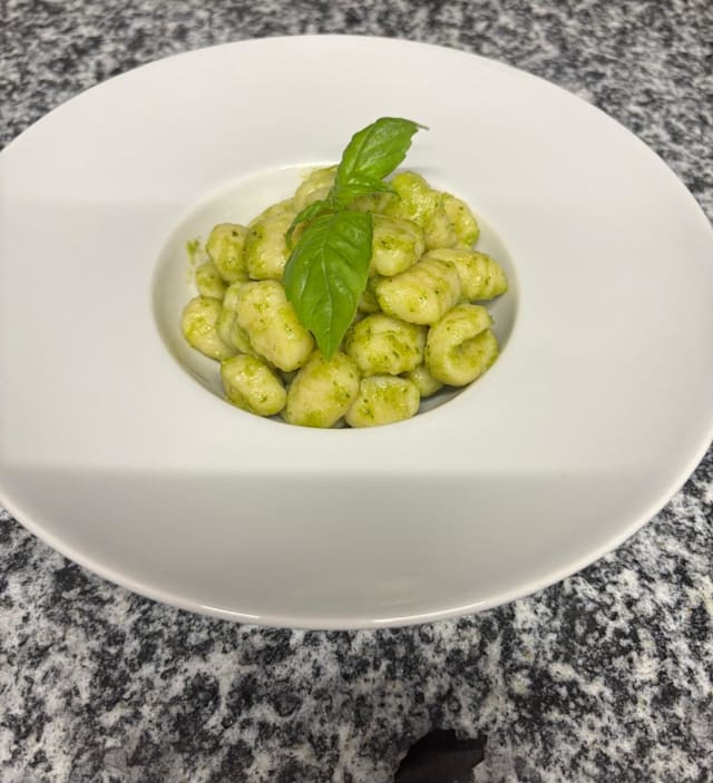 Pesto e salsiccia. Mozzarella fior di latte DOP, pesto di busalla, salsiccia di fossano, olio di valledolmo