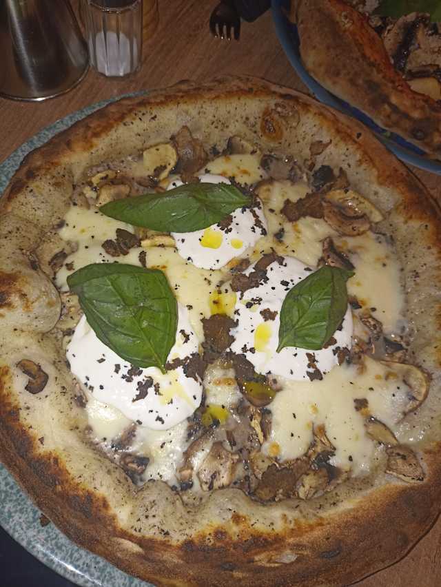 - Crème de truffe, mozzarella fior di latte, champignons coeur de burrata, truffe fraiche, basilic.