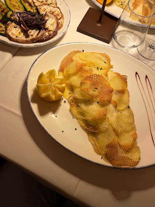 - Capasanta gratinata, polpo e patate, gamberi alla catalana, trancetto di polpo con crema di patate viola, frittino misto