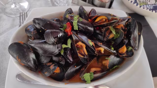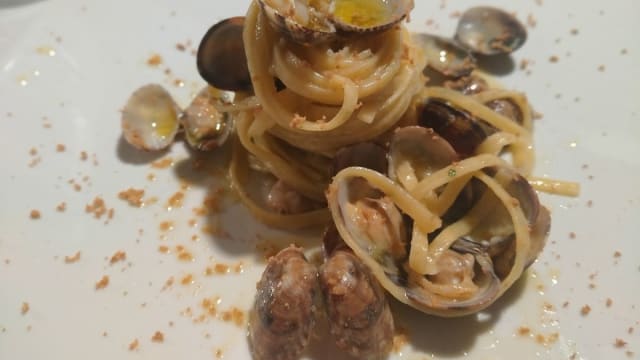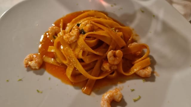 - Tonnarelli allo scoglio cozze, vongole gamberone con salsa di datterino