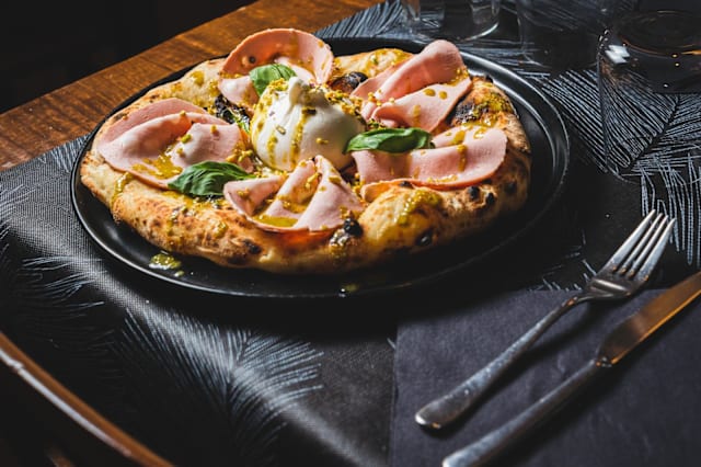 Fior di latte, mortadella, burrata, pesto di pistacchio, granella di pistacchio e basilico.
