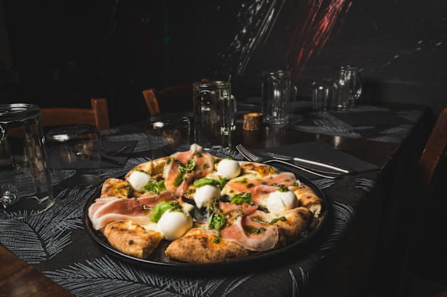 Fior di latte, cornicione ripieno di ricotta, prosciutto crudo, pesto e basilico.
