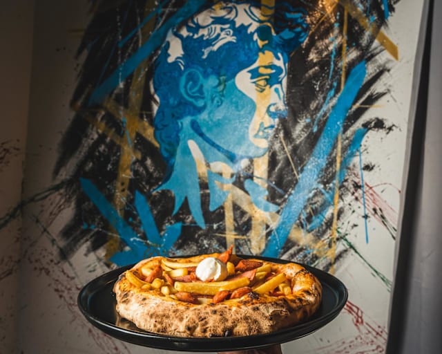 Mozzarella fior di latte, salsiccia, friarielli, patate al forno e basilico.